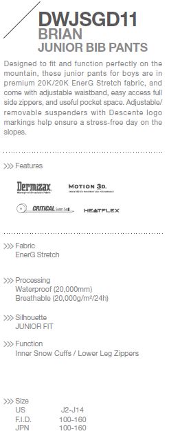 Pohodlné a maximálně funkční dětské kalhoty se šlemi a zvýšenými zády. Základem je velmi lehký materiál EnerG Stretch s membránou Dermizax. Termoizolaci zajišťuje výplň HEATFLEX. Vysoký komfort při užívání zajišťuje propracovaný střih a použitý materiál, který je na omak velmi jemný. Kalhoty jsou, shodně jako modely pro dospělé, vybaveny praktickými technickými detaily (tři zapínací kapsy, protisněhová ochrana spodní části nohavic, snadná regulace obvodu pasu a další).