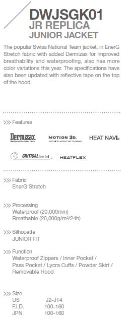 Dětská bunda Descente SWISS TEAM REPLICA JR je věrnou kopií dospělého modelu Swiss WC Replica, včetně autentických nášivek. Svrchní látka je z velmi lehkého a poddajného materiálu EnerG Stretch s membránou Dermizax. Optimální tepelnou pohodu zajišťuje termoizolační výplň Heatflex. Bundě nechybí ani praktické detaily shodné s modelem pro dospělé, jako např. kapsa na skipas na rukávu, vnitřní protisněhový pás, manžety na stahování rukávů, které lze snadno ovládat i v rukavicích a další.