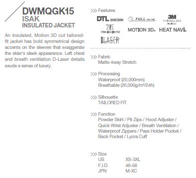Vysoce sportovní lyžařská bunda nabízí novou úroveň svobody a komfortu. Všesměrově elastický svrchní materiál Matt 4Way Stretch opatřený PU membránou Dermizax, termoizolační výplň Thinsulate a materiál Heat Navi, který dokáže velmi efektivně přeměnit široké spektrum paprsků slunečního záření na teplo. Pohodlí a naprostou volnost pohybu zaručuje skvělý střih a koncept Descente Motion 3D, který přesně kopíruje chování lidské kůže (stejně jako ona bunda nikde zbytečně neodstává ani netlačí).