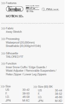 Kalhoty Swiss mají klasický pohodlný tvar body fit. V červené a černé barvě jsou v nabídce ve třech délkách: klasické-R, prodloužené o 5 cm-L a zkrácené o 5 cm-S. Designově jsou sladěny s bundami z materiálu 4Way Stretch. Naprostou volnost pohybu zajišťuje všesměrově elastický svrchní materiál 4way Stretch s PU membránou Dermizax, doplněný o koncept Descente Motion 3D, který přesně kopíruje chování lidské kůže, stejně jako ona kalhoty nikde zbytečně neodstávají ani netlačí. O tepelný komfort pečuje termoizolační výplň Thinsulate a materiál Heat Navi, který dokáže velmi efektivně přeměnit široké spektrum paprsků slunečního záření na teplo. Samozřejmě nechybí funkční detaily, jako jsou odepínací šle, dvě zapínací kapsy, rozpínací spodní části nohavic opatřené 3D ochranou proti proseknutí hranou lyže, snadno ovladatelné stahování v pase a další.