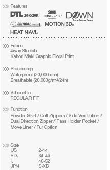 Elegantní dámská bunda v atraktivním jednoduchém designu s ladnou siluetou. Luxusní vzhled dodávají metalické zipy, detaily vytvořené laserovou technologií D-Laser. Nádherný vzhled doplňuje do barvy bundy laděná kožešina z mývala a Kahori Maki grafické zpracování podšívky. Volnost pohybu zaručuje koncept Descente Motion 3D, který přesně kopíruje chování lidské kůže (stejně jako ona bunda nikde zbytečně neodstává ani netlačí). Všesměrově elastický materiál 4Way Stretch s PU membránou DTL 20K/20K poskytují dokonalou ochranu proti nepřízni počasí. Tepelný komfort zajišťuje péřová výplň a materiál Heat Navi, který přeměňuje široké spektrum paprsků slunečního záření na teplo. Bundě samozřejmě nechybí ani množství velmi praktických detailů, jako např. velmi příjemný a teplý vniřní odnímatelný límec, dvojitý hlavní zip a další.