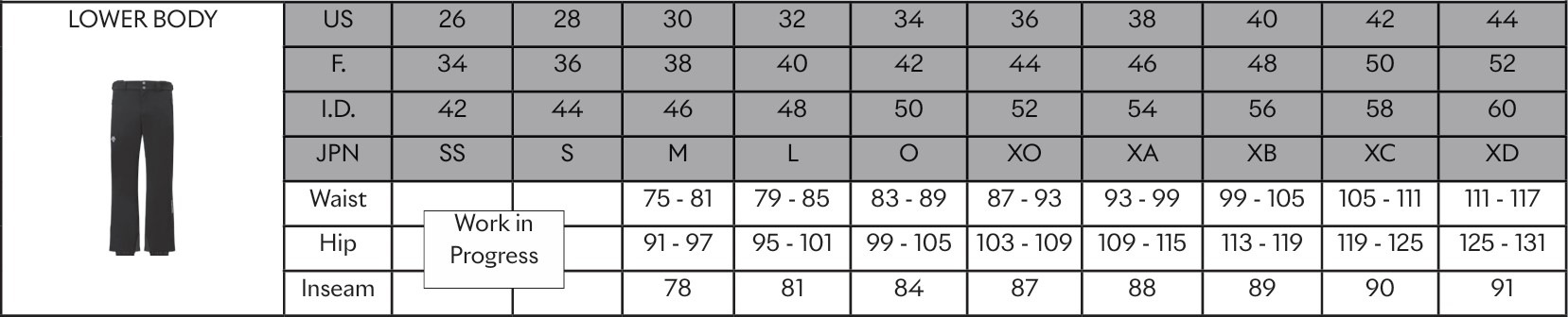 Dostupné velikosti se dodávají ve 3 délkách: R – regulérní (neuvádí se), S – zkrácená a L – prodloužená.