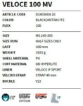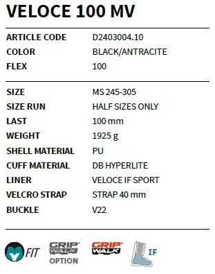 Dynamické zatáčení, rychlé tempo provádění obloučků a vysoký stupeň schopnosti ovládat lyže jdou v páru s ideálním dopasováním bot dle potřeb nohou lyžaře. Snadné obouvání i zouvání. Přesně tak lze popsat model lyžařských bot Dalbello VELOCE 100 MV. Horní část skeletu boty je díky dvojitému vstřikování materiálu při výrobě poněkud měkčí, než zpevněná dolní část. To se podepisuje příznivě na obouvání a umožňuje přitom precizní a dynamické ovládání lyží při sjezdu. Díky komínu boty Hyperlight s doplňkovým suchým zipem a optimálně dopasovanému flexu budou chodidla držena ve stabilní pozici a přenos řídících sil na lyže bude efektivní záležitostí. Lyžaře čeká příjemná a spíše sportovní jízda na sněhu. Přezky lze snadno dopínat tak, aby se tlak rozprostíral rovnoměrně na celé chodidlo a lýtko. Sportovní vnitřní bota pevně obepíná patu, drží ji na svém místě a vyznačuje se dobrou tepelnou izolací i za mrazivých zimních dnů. Díky technologii MyFit Program je možné upravovat vnější i vnitřní botu podle potřeb chodidla. Jako standard je namontována podrážka GripWalk, která usnadňuje chození po kluzkém namrzlém povrchu.