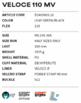 Snadný a efektivní přenos sil a úplná kontrola nad lyžemi i za vysoké sjezdové rychlosti, vysoký komfort nošení, obouvání a zouvání lyžáků. Přesně tak lze popsat model lyžařských bot Dalbello VELOCE 110 GW se šířkou 100 mm z dvojitě vstřikovaného materiálu svrchního skeletu z polyurethanu, vhodného pro závodění. Horní část boty je poněkud měkčí, což se podepisuje příznivě na obouvání a umožňuje přitom precizní a dynamické ovládání lyží při sjezdu. Chodidla jsou v lyžácích uchycena pevně na svém místě díky komínu z materiálu Hyperlight, širokému pásu Power Strap a optimálně dopasovanému flexu. Díky technologii Contour 5 se skelet i vnitřní bota precizně přizpůsobí tvaru chodidla lyžaře. Přirozeně pozměněný tvar nebude v žádném místě tlačit. Pokud se taková potřeba objeví, bude možné podle individuálních potřeb upravit také svrchní skelet boty. Stejně tak je plastickou i destička podešvi, která umožňuje přizpůsobit úhel vychýlení. Výložka vnitřní boty Contour 5 IF umožňuje pevnější držení paty a rovnoměrné rozložení hmotnosti a tlaku. Izolační výložka a tepelně spájené švy navyšují hřejivé vlastnosti, lyžáky proto ochrání chodidla před prochlazením odspodu i za mrazivých dnů. Díky technologii MyFit Program je možné upravovat vnitřní botu i skelet podle potřeb chodidla. Předem zamontované podrážky GripWalk usnadňují chození po kluzkém namrzlém povrchu.