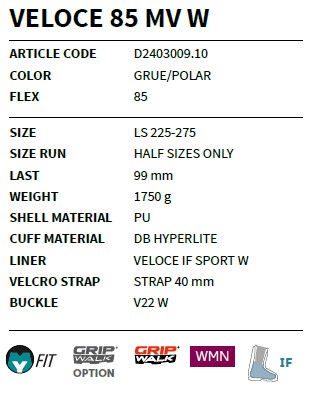 Do nedávné doby bylo obtížné spojit maximální pohodlí a vynikající sportovní výsledky v jedno. Nekomplikované obouvání a zouvání, pohodlné nošení, stabilita, dobrý přenos řídících sil a snadná ovladatelnost jsou vlastnostmi lyžáků Dalbello VELOCE 85 W GW, navržených v souladu se tvarem ženských chodidel. Inovativní skelet z polyurethanu se u lyžáků liší v tvrdosti materiálu v různých místech. Horní část boty je poněkud měkčí, což se podepisuje příznivě na obouvání a umožňuje přitom precizní a dynamické ovládání lyží při sjezdu. Chodidla jsou v lyžácích uchycena pevně na svém místě díky komínu z materiálu Hyperlite, snadno zapínatelným přezkám, doplňového suchému zipu a optimálně dopasovanému flexu, tvrdosti. Vnitřní bota IF Sport W pevně obepíná patu, drží ji na svém místě, přičemž tlak je příjemně rovnoměrný. Izolační výložka a tepelně spájené švy navyšují hřejivé vlastnosti, lyžáky proto ochrání chodidla před prochlazením odspodu i za mrazivých dnů. Díky technologii MyFit Program je možné upravovat vnitřní botu i skelet podle potřeb chodidla. Předem zamontované podrážky GripWalk usnadňují chození po kluzkém namrzlém povrchu.