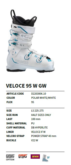 Dámské lyžařské boty Dalbello Veloce 95 GW, jsou určeny pro dámy, které hledají veškerý komfort v lyžařské botě, jistě uspokojí mnoho dam. Díky podšívce a stélce Primaloft poskytují boty Veloce 95 skvělé teplo i v těch nejchladnějších dnech spolu s vylepšenou tepelnou izolací. Díky klasickému střihu Overlap Shell je tato bota důkazem skvělého komfortu se špičkovými technologiemi. Model 95 je vybaven technologií Contour 5, která obsahuje přesně přednastavené oblasti s texturou 3D. K podrážce boty je přidána technologie Gripwalk, která usnadňuje chůzi bez ohledu na to, na jakém povrchu se nacházíte, od zledovatělého parkoviště až po obávané schody, které vás dovedou k vleku. A díky extra polstrovanému jazyku z paměťové pěny budou vaše holeně i chodidla v dokonalém pohodlí od začátku do konce. Pro dámy, které chtějí pokročit ve svých dovednostech a být v celodenním pohodlí, stojí dámské lyžařské boty Dalbello Veloce 95 GW určitě za zmínku.