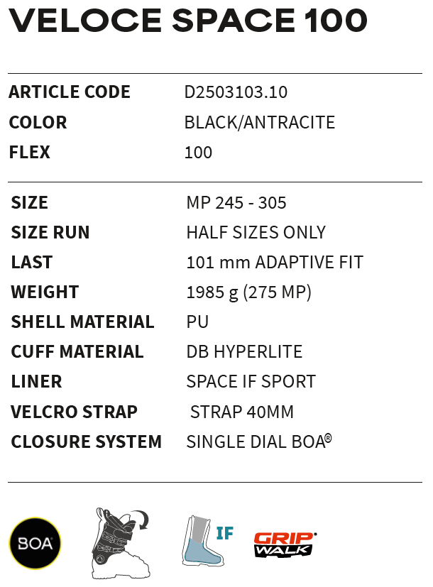 Ať lyžujete na upravených sjezdovkách, nebo prozkoumáváte volný terén, Veloce Space 100 je bota, která bude skvělým společníkem na všech vašich dobrodružstvích.