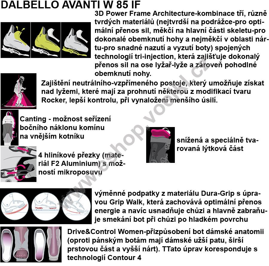 Dámské sjezdové boty pro dobré lyžařky s teplem tvarovatelnou vnitřní botičkou MyFit IF Perf (dámská úprava, přizpůsobení noze lyžařky 60%), která má zesílené zateplení (Tirol Wool). Poskytují sportovní výkon a díky přizpůsobení bot dámské anatomii (oproti pánským botám mají dámské užší patu, širší prstovou část, vyšší nárt, sníženou a speciálně tvarovanou lýtkovou část) jsou maximálně komfortní. Skelet, v nártní části široký 99 mm, je vyroben technologií 3D Power Frame Architecture, jejímž základem je kombinace tří, různě tvrdých materiálů (nejtvrdší na podrážce-pro optimální přenos energie, měkčí na hlavní části skeletu-pro dokonalé obemknutí nohy a nejměkčí v oblasti nártu-pro snadné nazutí a vyzutí boty), které jsou spojeny technologií tri-injection.