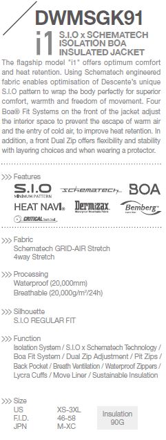 TOP bunda Descente s BOA systémem. Použitý nejmodernější elastický svrchní materiál SCHEMATECH GRID-AIR STRETCH v kombinaci 4WAY STRETCH s PU membránou Dermizax nabízí dokonalý komfort. Termoizolační výplň Primaloft a materiál Heat Navi (dokáže velmi efektivně přeměnit široké spektrum paprsků slunečního záření na teplo) zajišťují tepelnou pohodu za každého počasí. Naprostou volnost pohybu zaručuje skvělý střih S.I.O. CONCEPT ( přední, zadní část a růkávy jsou vyřezány laserem z jednoho kusu látky ) a koncept BOA, který umožňuje jednoduchým pohybem „kolečka“ přizpůsobit bundu momentálním požadavkům. Bunda disponuje spoustou praktických detailů, jako např. voděodolné překrytí zipů, ventilační prvky v límci a další.
