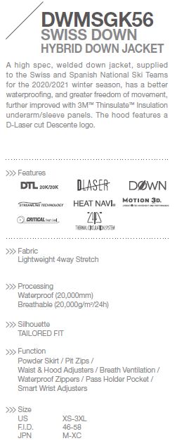 Skvěle vybavená péřová bunda dodávaná Švýcarskému a Španělskému lyžařskému národnímu týmu, která má vyšší voděodolnost a díky technologii Lightweight 4way Stretch disponuje větší volnosti pohybu. V ramenou a rukávech je tento model zateplen 3M Thinsulate. Na kapuci se nacházi laserem vyřezané logo Descente