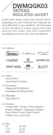 Sportovní bunda Descente Tatras s lehkým nádechem retro stylu. Použitý moderní elastický svrchní materiál 4WAY STRETCH , ve dvou variantách s PU membránou Dermizax nabízí dokonalý komfort. Termoizolační výplň Thinsulate a materiál Heat Navi (dokáže velmi efektivně přeměnit široké spektrum paprsků slunečního záření na teplo) zajišťují tepelnou pohodu za každého počasí. Naprostou volnost pohybu zaručuje skvělý střih a koncept Descente Motion 3D, který přesně kopíruje chování lidské kůže (stejně jako ona bunda nikde zbytečně neodstává ani netlačí). Funkční 3D motiv v oblasti ramen zajišťuje pohodlnější nošení lyží. Bundu podtrhují krásné detaily na rukávech a hrudi. Bunda disponuje spoustou praktických detailů, jako např. voděodolné překrytí zipů, ventilační prvky v límci a další.