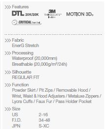Sportovní bunda ze svrchního materiálu EnergyG Stretch s PU membránou DTL 20/20 nabízí výborný poměr cena/výkon. O tepelné pohodlí se stará výplň Thinsulate. Bunda má i některé velmi zajímavé technické detaily, jako je voděodolný zip, podlepené švy, výbornou ventilaci , odnímatelnou kapuci a unikátní střih Motion 3D, který zaručuje svobodu při pohybu.