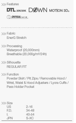 Elegantní dámská bunda v atraktivním decentním designu s ladnou siluetou. Volnost pohybu zaručuje koncept Descente Motion 3D, který přesně kopíruje chování lidské kůže (stejně jako ona bunda nikde zbytečně neodstává ani netlačí). Všesměrově elastické materiály EnerG Stretch s PU membránou DTL 20K/20K poskytují dokonalou ochranu proti nepřízni počasí. Tepelný komfort zajišťuje termoizolační výplň z kachního peří. Bundě samozřejmě nechybí ani množství velmi praktických detailů, jako např. velmi příjemný a teplý vniřní odnímatelný límec, obousměrný hlavní zip a další.
