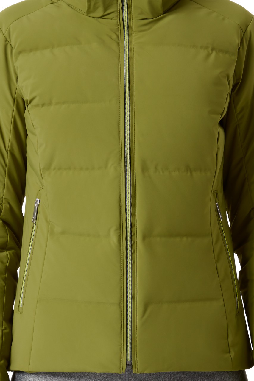 Jeden z Bestsellerů posledních let. Sportovně-elegantní lehká, péřová dámská bunda, která je vhodná nejen na lyžování, ale i na běžné nošení. Přední část bundy je o něco kratší než zadní, což je velice slušivé a umožňuje snadnější pohyb. Nevídanou volnost pohybu zaručuje koncept Descente Motion 3D, který přesně kopíruje chování lidské kůže (stejně jako ona bunda nikde zbytečně neodstává ani netlačí). Ochranu proti nepřízni počasí má na starost svrchní elastický materiál Lightweight Stretch s PU membránou DTL 20K/20K. Tepelný komfort zajišťuje termoizolační výplň z prachového peří a materiál Heat Navi, který přeměňuje široké spektrum paprsků slunečního záření na teplo. Bundě samozřejmě nechybí ani množství velmi praktických detailů, jako např. extra zateplené kapsy, zesílené náplety na krku a koncích rukávů a další.