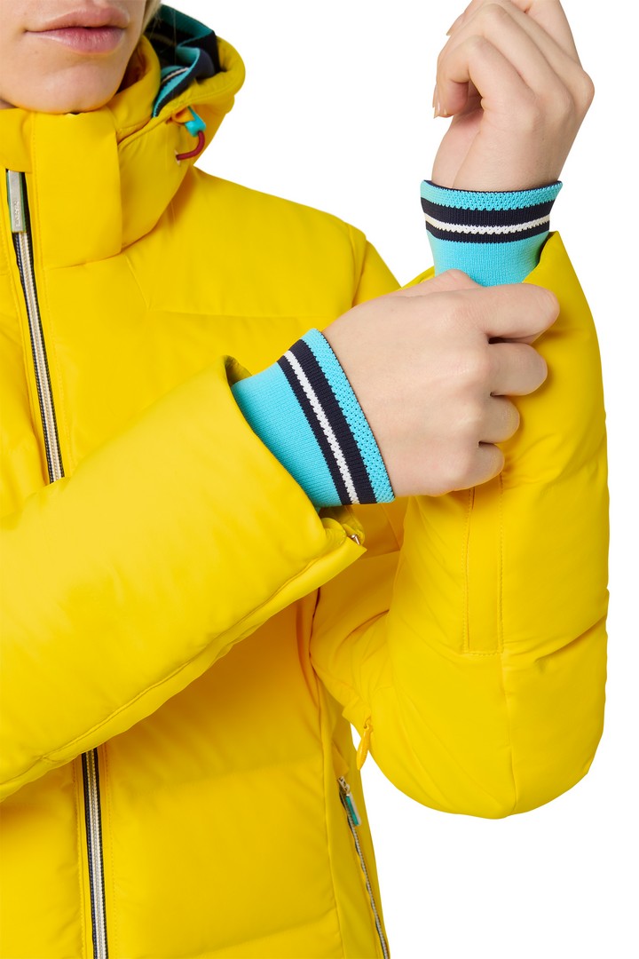 Jeden z Bestsellerů posledních let. Sportovně-elegantní lehká, péřová dámská bunda, která je vhodná nejen na lyžování, ale i na běžné nošení. Přední část bundy je o něco kratší než zadní, což je velice slušivé a umožňuje snadnější pohyb. Nevídanou volnost pohybu zaručuje koncept Descente Motion 3D, který přesně kopíruje chování lidské kůže (stejně jako ona bunda nikde zbytečně neodstává ani netlačí). Ochranu proti nepřízni počasí má na starost svrchní elastický materiál Lightweight Stretch s PU membránou DTL 20K/20K. Tepelný komfort zajišťuje termoizolační výplň z prachového peří a materiál Heat Navi, který přeměňuje široké spektrum paprsků slunečního záření na teplo. Bundě samozřejmě nechybí ani množství velmi praktických detailů, jako např. extra zateplené kapsy, zesílené náplety na krku a koncích rukávů a další.