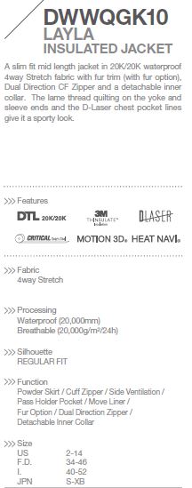 Elegantní dámská bunda v atraktivním decentním designu s ladnou siluetou. Luxusní vzhled dodávají detaily vytvořené laserovou technologií D-Laser a tenké linky v kontrastní barvě. Volnost pohybu zaručuje koncept Descente Motion 3D, který přesně kopíruje chování lidské kůže (stejně jako ona bunda nikde zbytečně neodstává ani netlačí). Všesměrově elastické materiály 4Way Stretch s PU membránou DTL 20K/20K poskytují dokonalou ochranu proti nepřízni počasí. Tepelný komfort zajišťuje termoizolační výplň Thinsulate a materiál Heat Navi, který přeměňuje široké spektrum paprsků slunečního záření na teplo. Bundě Layla samozřejmě nechybí ani množství velmi praktických detailů, jako např. velmi příjemný a teplý vniřní odnímatelný límec, obousměrný hlavní zip a další.