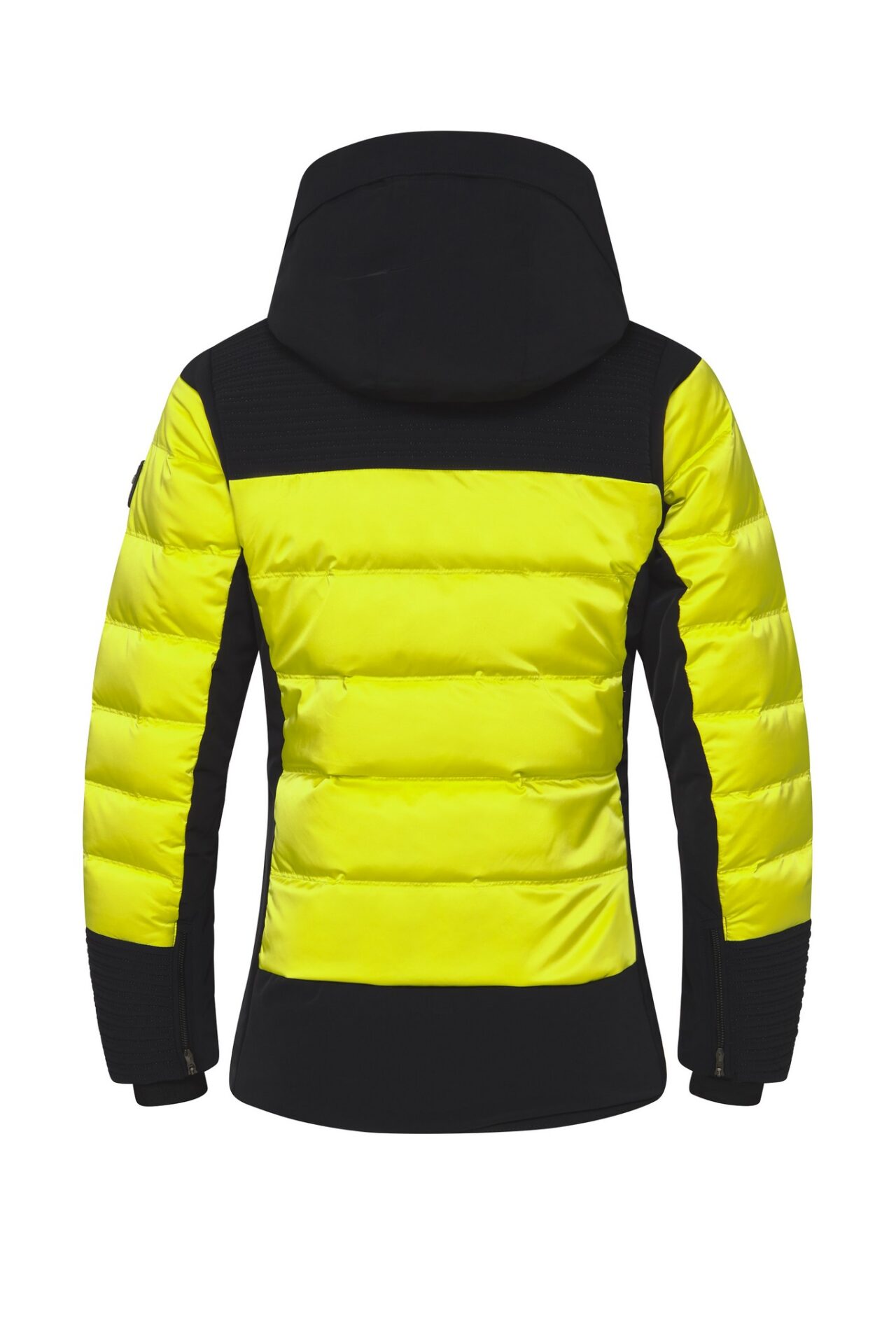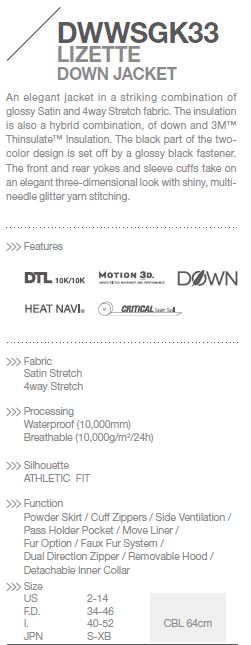 Elegantní bunda, která kombinuje satén a 4Way Stretch materiál. Jako výplň je zde použita taktéž kombinace dvou materiálu a to peří a 3M Thinsulate. Přední a zadní část bundy pod límcem a spodní část rukávu tvoří elegantní 3D vzhled, který je protkán třpitící se nití.