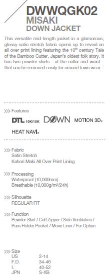Bunda je z velice lehké a moderní látky Satin Stretch , která zvýrazňuje její luxus. Naprostou volnost pohybu zaručuje koncept Descente Motion 3D. Svrchní materiál je opatřen PU membránou DTL 10K/10K, takže poskytuje vynikající ochranu proti nepřízni počasí. Dokonalý tepelný komfort zajišťuje termoizolační výplň z prachového peří a materiál Heat Navi, který přeměňuje široké spektrum paprsků slunečního záření na teplo. Bundě samozřejmě nechybí ani množství velmi praktických detailů.