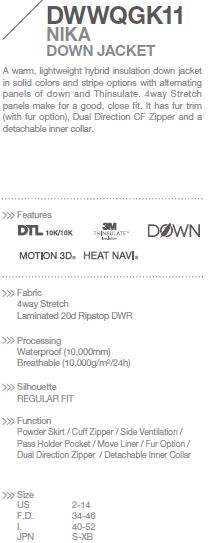 Nadčasová dámská péřová sportovně-elegantní bunda. Díky lesklému svrchnímu materiálu Laminated 20d Ripstop DWR je velmi atraktivní, vsazené panely všesměrově elastického materiálu 4Way Stretch pak ještě zvýrazňují její elegantní siluetu. Naprostou volnost pohybu zaručuje koncept Descente Motion 3D, který přesně kopíruje chování lidské kůže (stejně jako ona bunda nikde zbytečně neodstává ani netlačí). Svrchní materiály jsou opatřeny PU membránou DTL, takže poskytují vynikající ochranu proti nepřízni počasí. Dokonalý tepelný komfort zajišťuje termoizolační výplň z prachového peří a materiál Heat Navi, který přeměňuje široké spektrum paprsků slunečního záření na teplo. Bundě samozřejmě nechybí ani množství velmi praktických detailů, jako je např. elastická podšívka, velmi příjemný odnímatelný vnitřní límec a další.