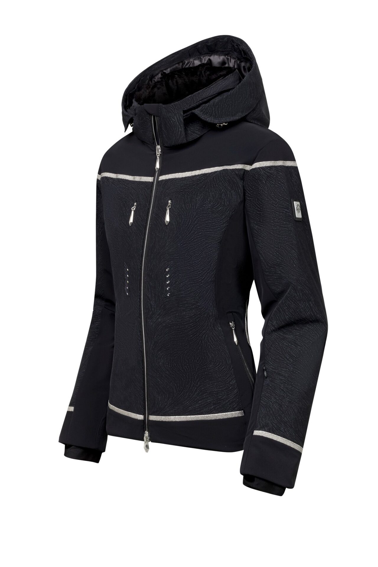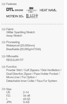 Elegantní dámská bunda v atraktivním designu doplněná o Swarovski krystaly. Luxusní vzhled dodávají metalické zipy, detaily vytvořené laserovou technologií D-Laser. Nádherný vzhled doplňuje do barvy bundy laděná kožešina z mývala. Volnost pohybu zaručuje koncept Descente Motion 3D, který přesně kopíruje chování lidské kůže (stejně jako ona bunda nikde zbytečně neodstává ani netlačí). Všesměrově elastický materiál 4Way Stretch s PU membránou DTL 20K/20K poskytují dokonalou ochranu proti nepřízni počasí. Tepelný komfort zajišťuje péřová výplň a materiál Heat Navi, který přeměňuje široké spektrum paprsků slunečního záření na teplo. Bundě samozřejmě nechybí ani množství velmi praktických detailů, jako např. velmi příjemný a teplý vniřní odnímatelný límec, obousměrný hlavní zip a další.