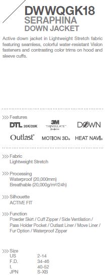 Jeden z Bestsellerů posledních let. Sportovně-elegantní lehká, péřová dámská bunda, která je vhodná nejen na lyžování, ale i na běžné nošení. Drobné ozdobné prvky jsou vytvořeny pomocí laserové technologie D-Laser. Nevídanou volnost pohybu zaručuje koncept Descente Motion 3D, který přesně kopíruje chování lidské kůže (stejně jako ona bunda nikde zbytečně neodstává ani netlačí). Ochranu proti nepřízni počasí má na starost svrchní elastický materiál Lightweight Stretch s PU membránou DTL 20/20. Tepelný komfort zajišťuje termoizolační výplň z prachového peří a materiál Heat Navi, který přeměňuje široké spektrum paprsků slunečního záření na teplo. Bundě Seraphina samozřejmě nechybí ani množství velmi praktických detailů, jako např. extra zateplené kapsy, zesílené náplety na krku a koncích rukávů a další.