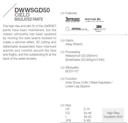 Dámské kalhoty Cielo s odepínacími šlemi mají klasický pohodlný tvar body fit a vyšší, zasílenou a elastickou bederní část. Naprostou volnost pohybu zajišťuje všesměrově elastický svrchní materiál doplněný o koncept Descente Motion 3D, který přesně kopíruje chování lidské kůže, stejně jako ona, kalhoty nikde zbytečně neodstávají ani netlačí. Ochranu před nepřízní počasí má na starosti membrána Dermizax a termoizolační výplň 3M Thinsulate.