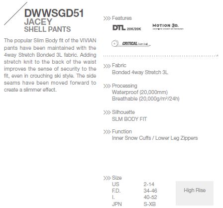 Jedny z nejpopulárněnjších kalhot nejen k řadě bund Glamour. Elegantní dámské kalhoty na tělo – šponovky. Naprostou volnost pohybu zajišťuje elastický materiál doplněný o koncept Descente Motion 3D, který přesně kopíruje chování lidské kůže, stejně jako ona kalhoty nikde zbytečně neodstávají ani netlačí. Ochranu před nepřízní počasí má na starost elastická textilie 4Way Bonding opatřená PU membránou DTL 20/20. Díky počesu na vnitřní straně má i výborné termoizolační vlastnosti.