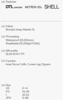 Jedny z nejpopulárněnjších kalhot nejen k řadě bund Glamour. Elegantní dámské kalhoty na tělo – šponovky. Naprostou volnost pohybu zajišťuje elastický materiál doplněný o koncept Descente Motion 3D, který přesně kopíruje chování lidské kůže, stejně jako ona kalhoty nikde zbytečně neodstávají ani netlačí. Ochranu před nepřízní počasí má na starost elastická textilie 4Way Bonding opatřená PU membránou DTL 20/20. Díky počesu na vnitřní straně má i výborné termoizolační vlastnosti.