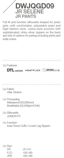 Pohodlné a maximálně funkční dívčí kalhoty v dámském džínovém střihu. Základem je velmi lehký materiál Vital Stretch s PU membránou DTL 20K. Termoizolaci zajišťuje výplň HEATFLEX 40. Vysoký komfort při užívání zajišťuje propracovaný střih a použitý materiál, který je na omak velmi jemný. Kalhoty jsou, shodně jako modely pro dospělé, vybaveny praktickými technickými detaily (zapínací kapsy na zadku, protisněhová ochrana spodní části nohavic, snadná regulace obvodu pasu a další).