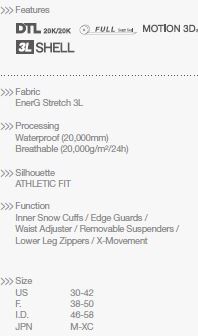 KENZO jsou velice technické allmountain kalhoty , rovné nohavice a zvýšený pas bránící průniku sněhu. Z materiálu 3L SHELL doplněny membránou DTL 20/20 , který zaručuje komfort i v hlubokém sněhu. Kalhoty disponují praktickými detaily – uzavíratelnýni ventilačními průduchy na stehnech, třemi kapsami s voděodolnými zipy, vodotěsným podlepením všech švů.