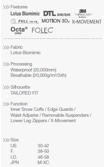 Kalhotům samozřejmě nechybí velmi atraktivní a funční detaily, při jejich výrobě jsou použity moderní výrobní postupy, jako např. vyřezávání laserovou technologií D-Laser, odnímatelné kšandy, ochrana proti proseknutí, protisněhový pás, a další.