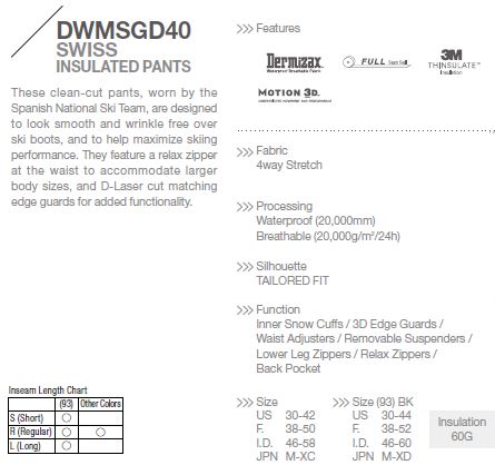 Kalhoty Swiss mají klasický pohodlný tvar body fit. V černé barvě jsou v nabídce ve třech délkách: klasické – R (neuvádí se), prodloužené o 5 cm – L a zkrácené o 5 cm – S. Designově jsou sladěny s bundami z materiálu 4Way Stretch. Naprostou volnost pohybu zajišťuje všesměrově elastický svrchní materiál 4way Stretch s PU membránou Dermizax, doplněný o koncept Descente Motion 3D, který přesně kopíruje chování lidské kůže, stejně jako ona kalhoty nikde zbytečně neodstávají ani netlačí. O tepelný komfort pečuje termoizolační výplň Thinsulate a materiál Heat Navi, který dokáže velmi efektivně přeměnit široké spektrum paprsků slunečního záření na teplo. Samozřejmě nechybí funkční detaily, jako jsou odepínací šle, dvě zapínací kapsy, rozpínací spodní části nohavic opatřené 3D ochranou proti proseknutí hranou lyže, snadno ovladatelné stahování v pase a další.