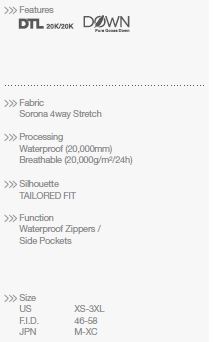 Samozřejmostí je dokonale padnoucí střih, voděodolné podlepení všech švů a excelentní termoizolační vlastnosti – kombinace materiálu Heat Navi a péřové výplně.