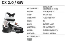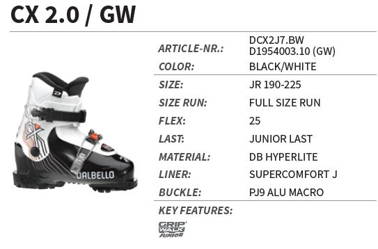 Dětské sjezdové boty pro malé lyžaře Dalbello CX 2 patří do kategorie Allmountain. Tomu odpovídá skelet s nižším profilem, který má flexi optimalizovanou s ohledem na malé zatížení. Díky konstrukci Cabrio (skelet má 3 části: nosnou z velmi pevného a lehkého materiálu, vrchní anatomicky tvarovanou manžetu a vnější pružný jazyk) se boty dobře nazouvají i vyzouvají. O dokonalé usazení na nohu malého lyžaře se starají dvě lehké a pevné polykarbonátové přezky (vyšší v ráčnovém provedení s širokým rozpětím nastavení).
