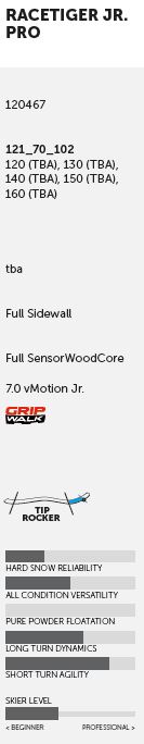 RACETIGER JR PRO disponují také tip rockerem a jsou dostupné v délkách 120-160 cm . Dodávány jsou v setu s vázáním Marker VMotion Jr 7.0 ( GripWalk kompatibilní ).