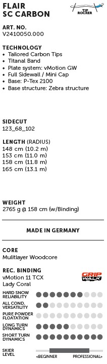 Dámská lyže Völkl Flair SC Carbon je snadno ovladatelný slalom carver s perfektní kombinací dynamických schopností. Je laděna s několika konstrukčními prvky do dokonale funkčního celku. Základem je upravené dřevěné jádro Mulitlayer Woodcore, které je zesílené dynamickým pásem Titanal Band a pevnou bočnicí Full Sidewall / Mini Cap. To doplňuje tvar prohnutí s lehce přizdvednutou špičkou Tip Rocker. Ve špičče a patě je sklolaminátová vrstva dplněna o 3D.Glass (trojrozměrné a vícenásobně skládané skelné vrstvy na krajích mají za následek zvýšenou přilnavost hran a živější chování při výjezdu z oblouku) a uvnitř lyže je zabudováno osvědčené, vícevrstvé, dřevěné jádro s kombinací topolu a buku.