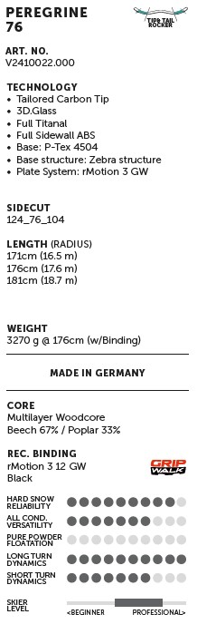 Přední a zadní část lyže je vyrobena z materiálu 3D.Glass (trojrozměrné a vícenásobně skládané skelné vrstvy ve špičce a v oblasti patky mají za následek zvýšenou přilnavost hran a živější chování při výjezdu z oblouku) a uvnitř lyže je zabudováno osvědčené, vícevrstvé, dřevěné jádro s kombinací topolu a buku. Dvě celoplošné vrstvy Titanalu zajišťují obvyklou tuhost. Jízdní vlastnosti lyže Völkl Peregrine 76 posiluje i nové vázání rMotion3 GW. Zkrácená deska v kombinaci s širším vrtání poskytuje přímější, výkonnější přenos síly a umožňuje rychlejší přehranění.