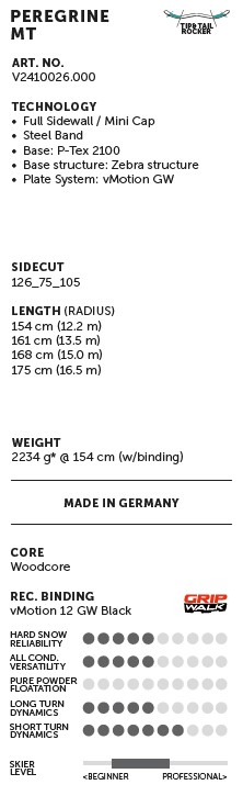 Peregrine MT jsou výborné univerzální lyže pro střední oblouk. Díky dřevěnému jádru WOODCORE doplněné o ocelový plát Steel Band, jsou lyže dostatečně stabilní a dynamické , zaručují výborný přenos sil na hranu lyže.