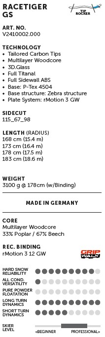 Skvělé lyže na delší oblouky na tvrdých upravených svazích. Základem je sendvičová konstrukce s vícevrstvým dřevěným jádrem Multilayer Woodcore, kdy samotné jádro je vyrobeno ze dvou druhů dřeva – tvrdší buk v oblasti hran, měkčí topol ve středu lyže. Uvedené jádro je ještě z horní i dolní strany vyztuženo titanalovým plechem. Jádro je dále doplněno novou technologií 3D.GLASS, která lyži dělá hravější. Model Racetiger GS má lehce přizvednutou špičku Tip Rocker pro snazší ovládání při nájezdu do oblouku. Rychlost skluzu, a tím i lyží, zajišťuje použití vysokomolekulární závodní skluznice P-Tex 4504, spolu s úpravou bočnic Full Sidewall.