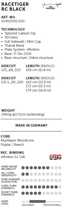 Model Racetiger RC je dodáván s novým vázáním vMotion GW. To kombinuje moderní technologie, špičkové bezpečnostní standardy značky Marker, dokonalý přenos sil (širší a nižší uložení na lyži) a snadné nastavení na velikost boty.