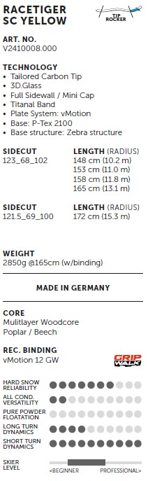 Model Racetiger SC je dodáván s vázáním vMotion GW. To kombinuje moderní technologie, špičkové bezpečnostní standardy značky Marker, dokonalý přenos sil (širší a nižší uložení na lyži) a snadné nastavení na velikost boty.
