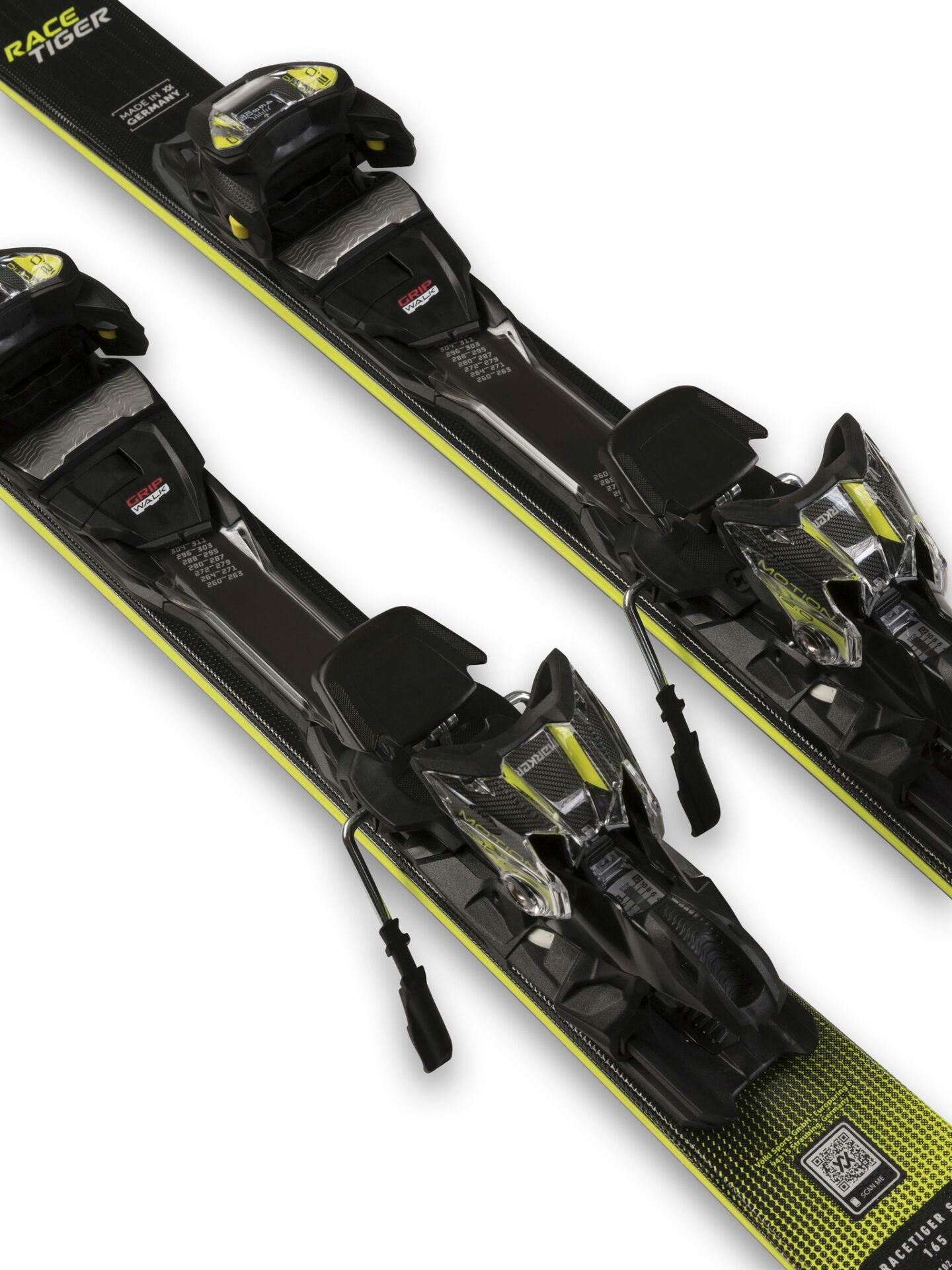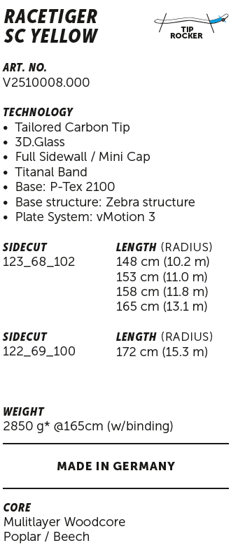 Model Racetiger SC je dodáván s vázáním vMotion GW. To kombinuje moderní technologie, špičkové bezpečnostní standardy značky Marker, dokonalý přenos sil (širší a nižší uložení na lyži) a snadné nastavení na velikost boty.